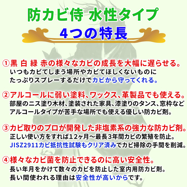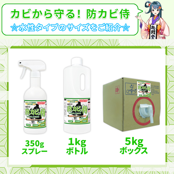 防カビ侍 水性タイプ 350g(緑色ラベル) / 部屋の壁紙 木材 畳をカビから守る業務用クラスの非塩素系カビ防止スプレー / 種類や使い方