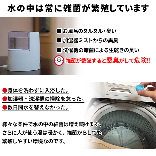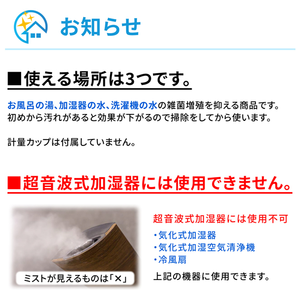 本製品は加湿器(超音波式加湿器を除く)、お風呂(湯船)、洗濯機に使えます。