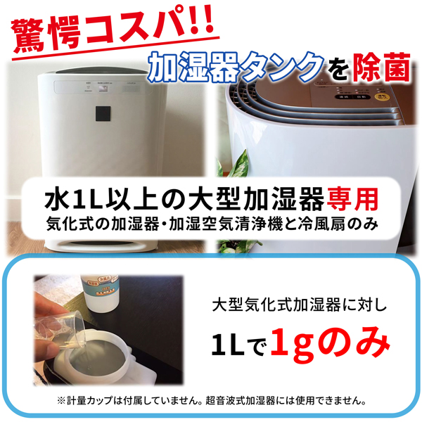 超音波式加湿器と超音波+加熱のハイブリッド式には使えません。加熱式加湿器は熱で除菌されるので本製品は不要です。