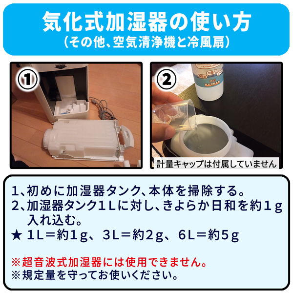本製品の「商品説明」「使い方」「注意点」は水の除菌剤 きよらか日和 1kgの商品ページに掲載されています。